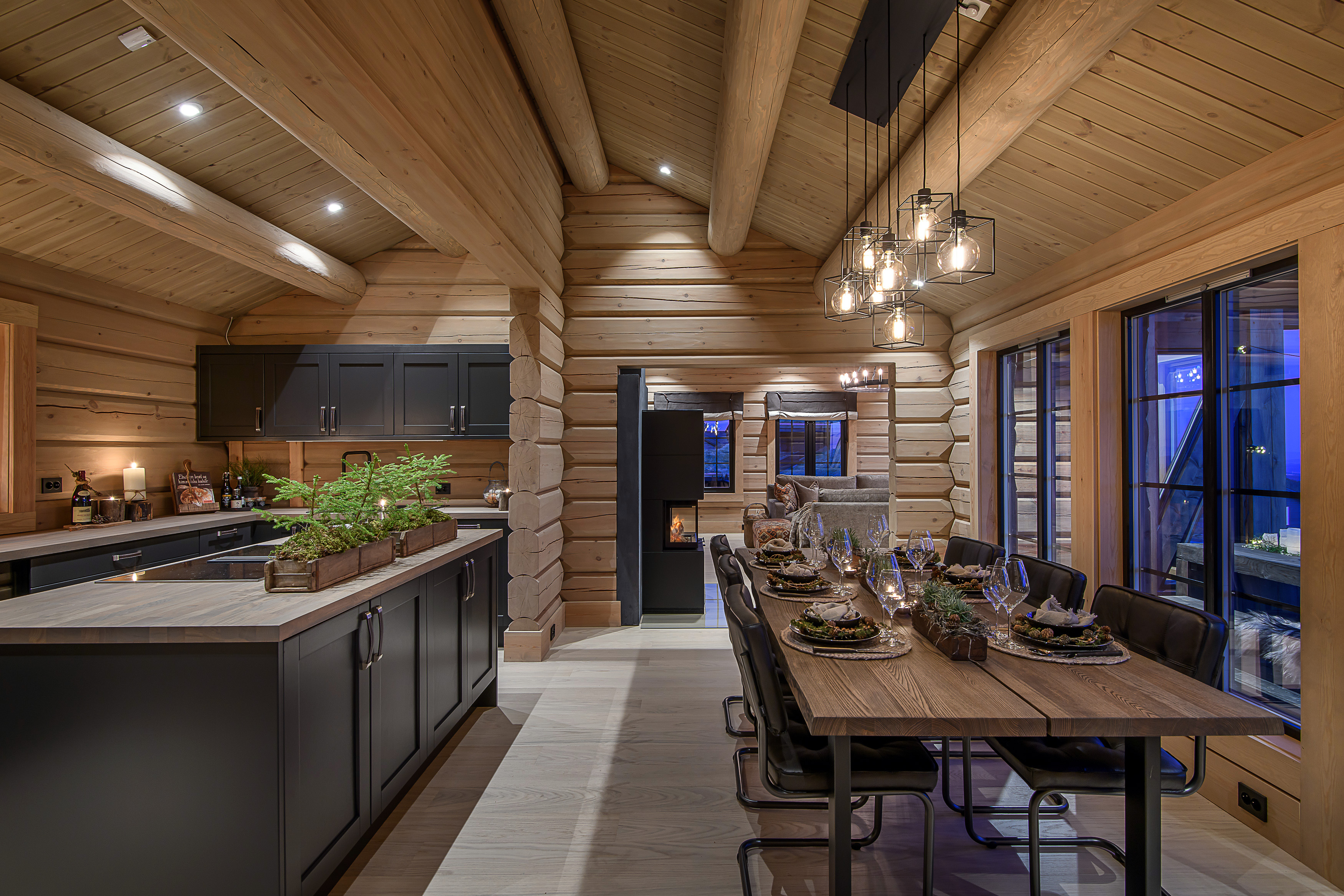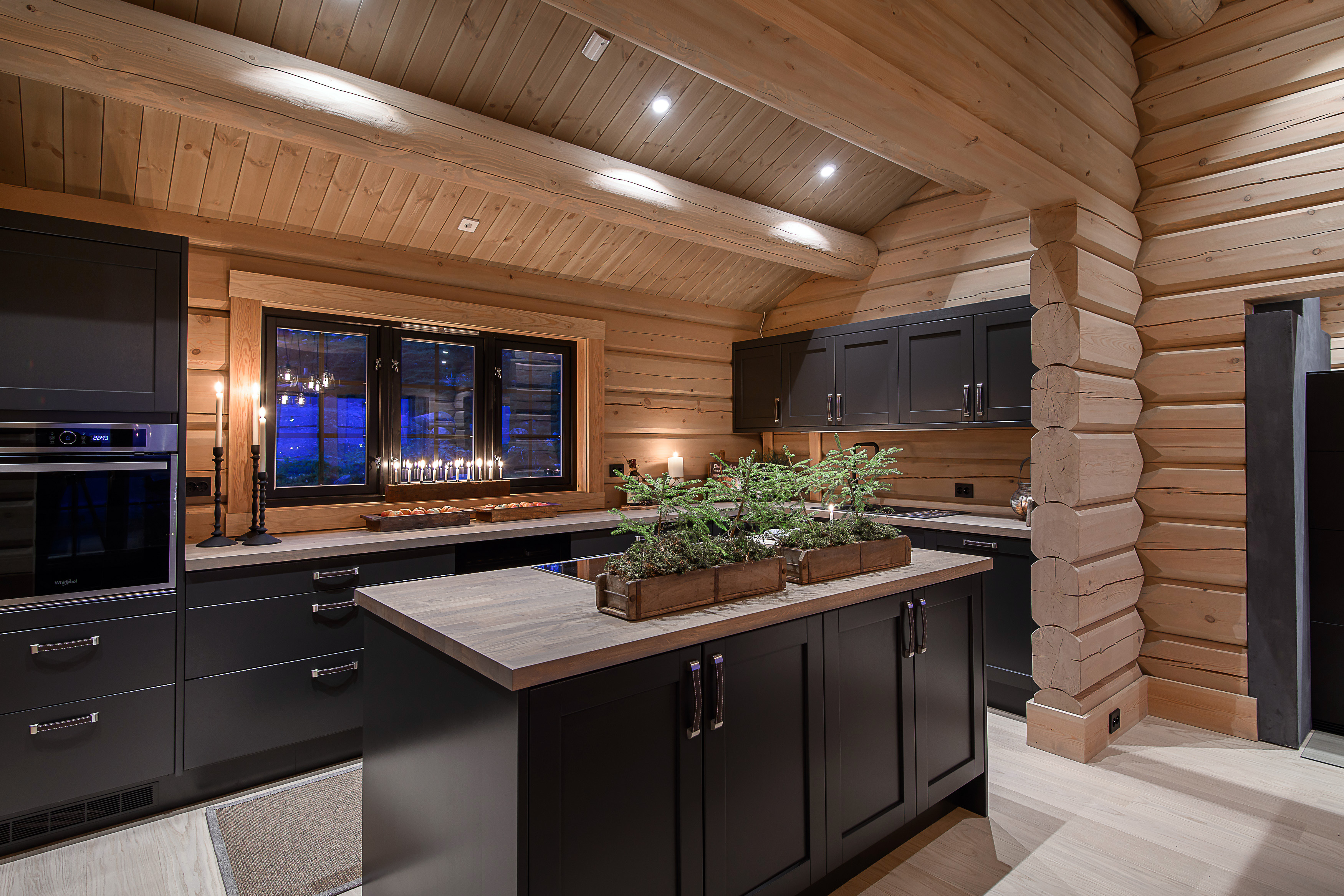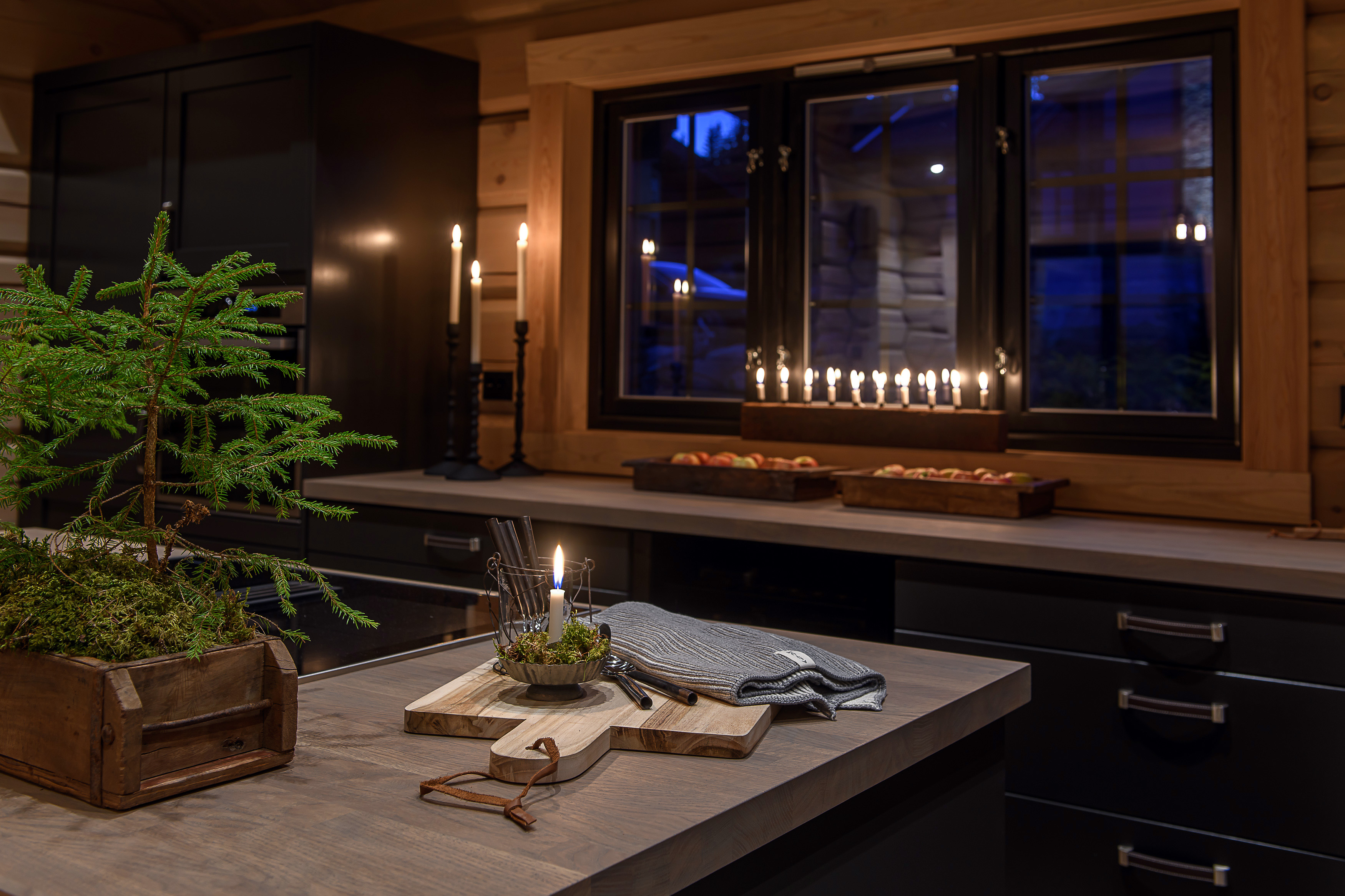 Kjøkkenet er malt i Fargen Dempet sort (S8500-N) og har en gråoljet 40 mm eikeplate.